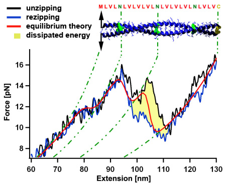 The folding of coiled coils is not completely in thermodynamic equilibrium since a few kT are dissipated to the heat bath per unzipping/rezipping cycle (yellow area). If the pulling speed of the unzipping/rezipping cycles is further increased, more energy gets dissipated and the system gets pushed further towards non-equilibrium. Since we can determine the energy needed to unfold the structure and the energy gained during folding of the coiled coil (histograms for Poff and Pon) for different cycle speeds, we can experimentally test fluctuation theorems that link the non-equilibirum regime with equilibrium thermodynamics. [read more]